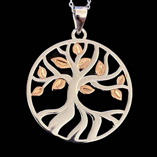 - Round pendant with rose gold plated leaves, silver branches and roots