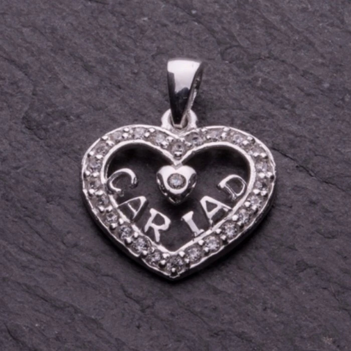 - Sterling silver cariad word (Welsh for love) surrounded by a patterned heart.