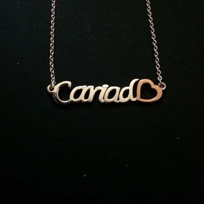 - Sterling silver cariad (Welsh for love) with rose gold.