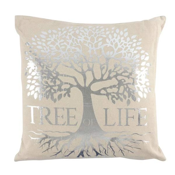 - This square cushion will fit in beautifully with most home decor colour schemes, with its natural hue and metallic silver Tree of Life pattern