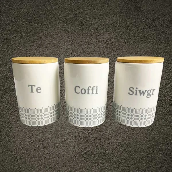 These Welsh language kitchen containers are perfect for storing tea, coffee and sugar. They’re made of ceramic with bamboo lids that have air-tight seals to keep the contents fresh. The neutral grey color is great for any style of kitchen decor. And the traditional Welsh tapestry pattern design on them will make you smile every time you see it!
