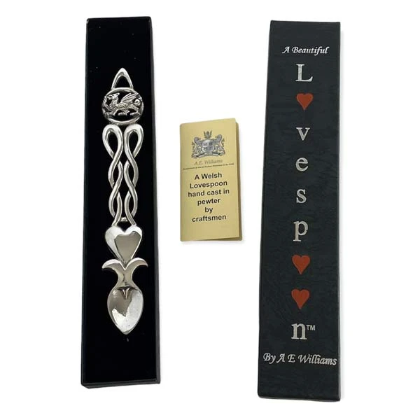 Welsh dragon love spoon in pewter with Celtic knot and heart. This beautifully crafted love spoon comes in a quality gift box with an information booklet about the history of Welsh love spoon making.