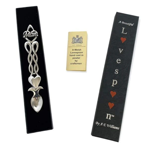 Pewter love spoon with mam lettering, infinite Celtic knot and heart. This beautifully crafted love spoon comes in a quality gift box with an information booklet about the history of Welsh love spoon making. The perfect gift of love for that special Welsh mam.
