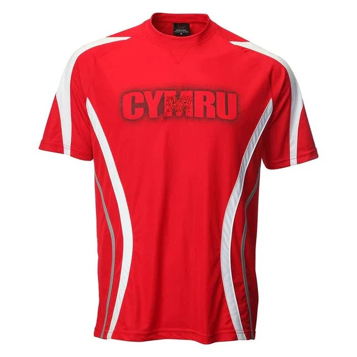 - Red t-shirt with Cymru print and embroidered Welsh dragon in centre.