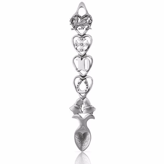 The Pewter Welsh love spoon is the perfect present for a 10th anniversary or birthday. The spoon includes symbols of protection, good luck, and love.