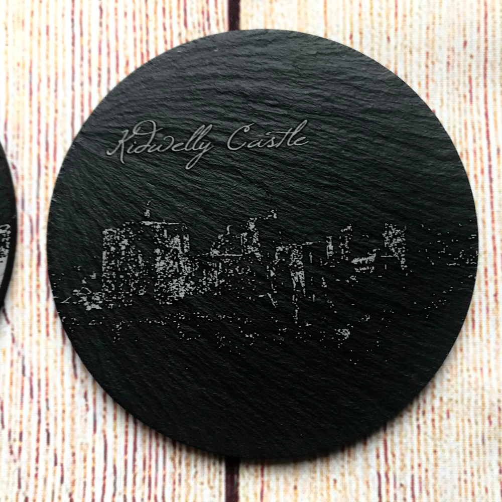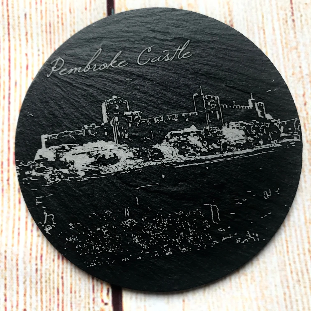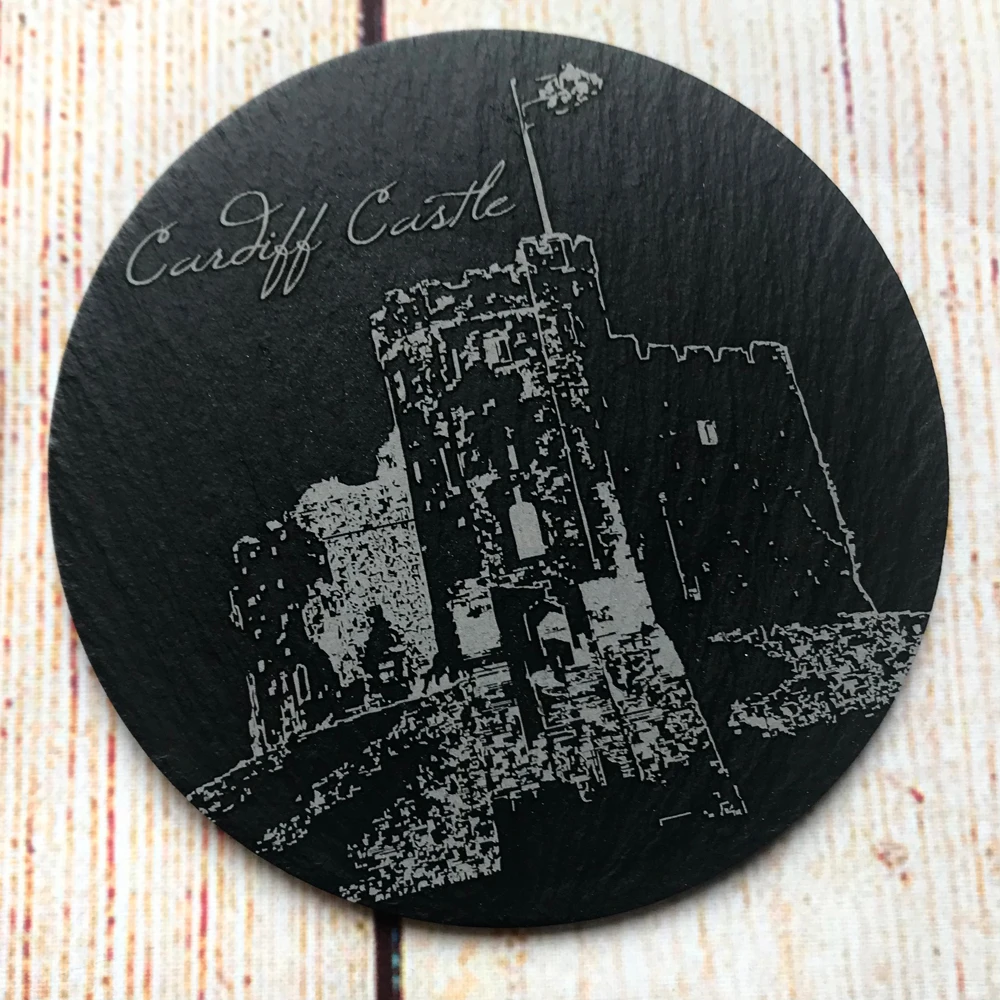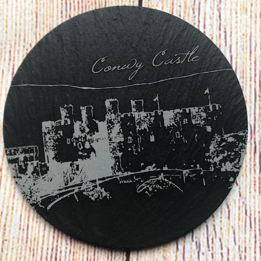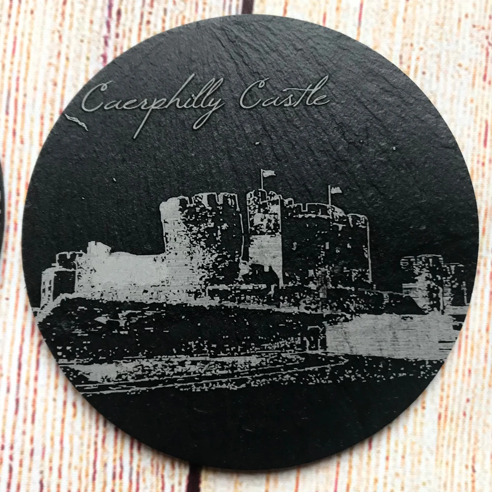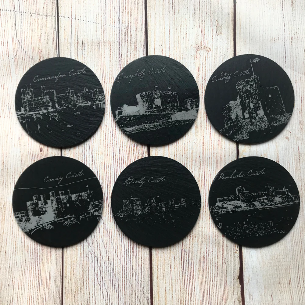 - Set of 6 Welsh slate coasters with Welsh castles including Caerphilly Castle, Conwy Castle, Caernarfon Castle, Cardiff Castle, Kidwelly Castle and Pembroke Castle