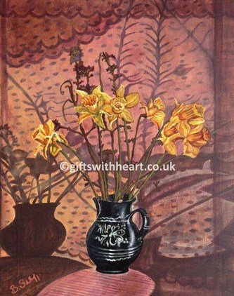 Original acrylic painting of Welsh daffodils in a black vase with strong shadows cast on the wall behind.